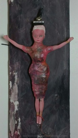 Repurposed Barbie doll, paper clay, medical tape, acrylic paint, shoe polish, found objects, functional on/off switch, waxed linen, found repurposed wood substrate