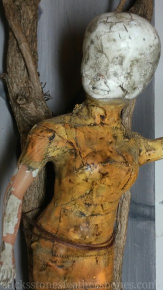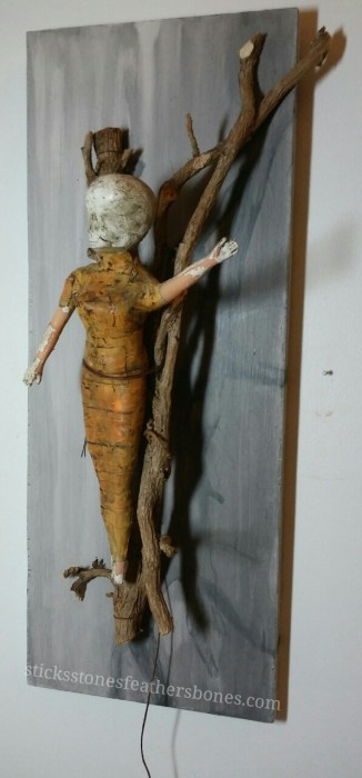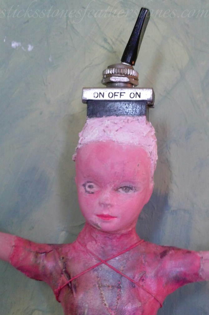 Repurposed Barbie doll, paper clay, medical tape, acrylic paint, shoe polish, found objects, functional on/off switch, waxed linen, found repurposed wood substrate