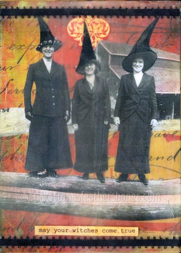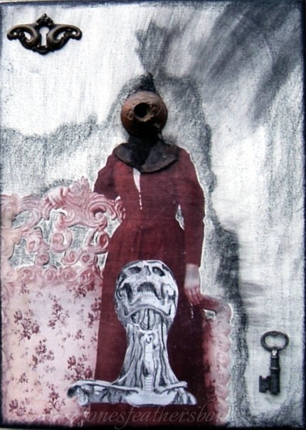 vintage photo, scraps of paper, metal washer stencils, ink, many layers of wax
